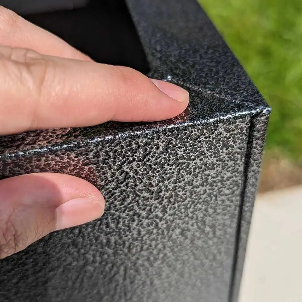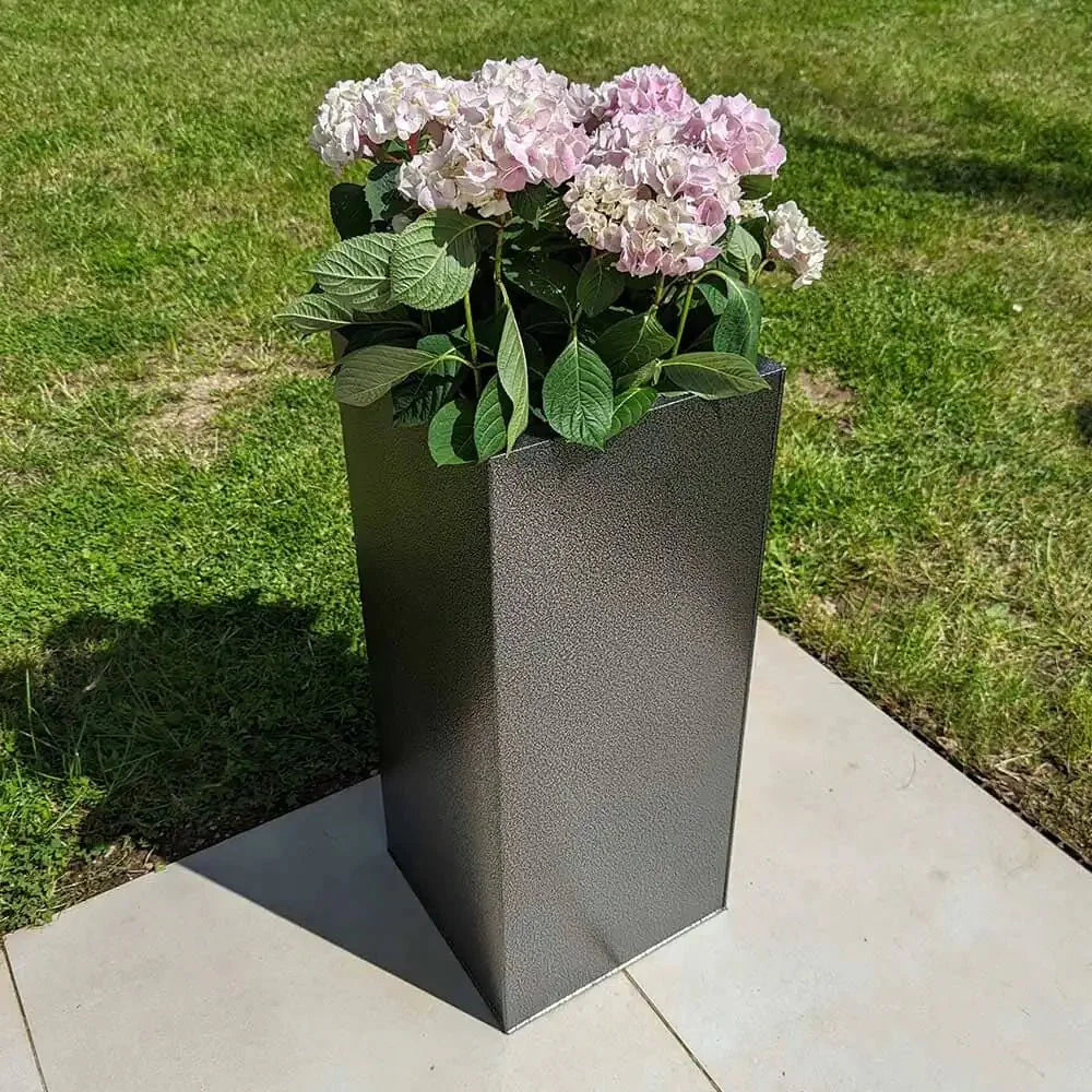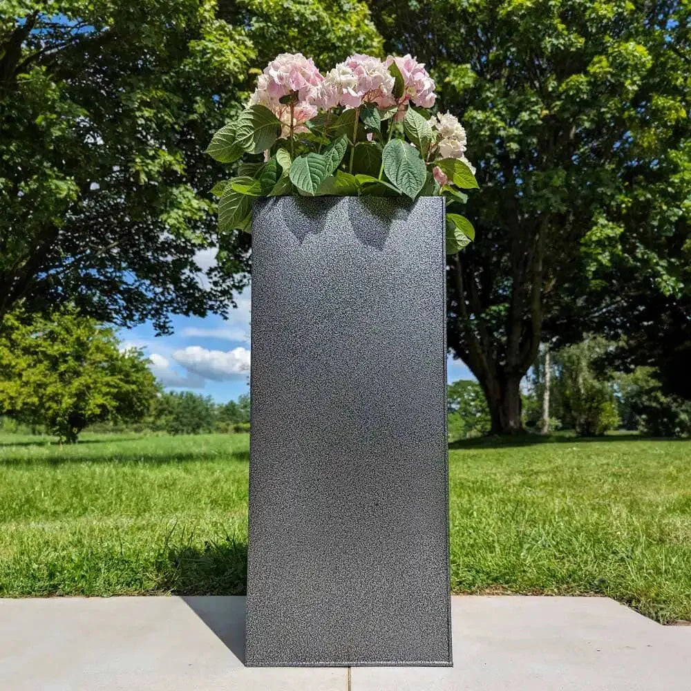 This 75cm standing planter boasts a captivating textured black and silver colour scheme, blending seamlessly with any outdoor space. Crafted from galvanized aluzinc and powder coated for durability, it's a reliable choice for gardeners. As a tall planter, it accommodates all flora, serving as both a flower planter and a tree planter. Elevate your garden with its sleek design and ample space for large plant pots.