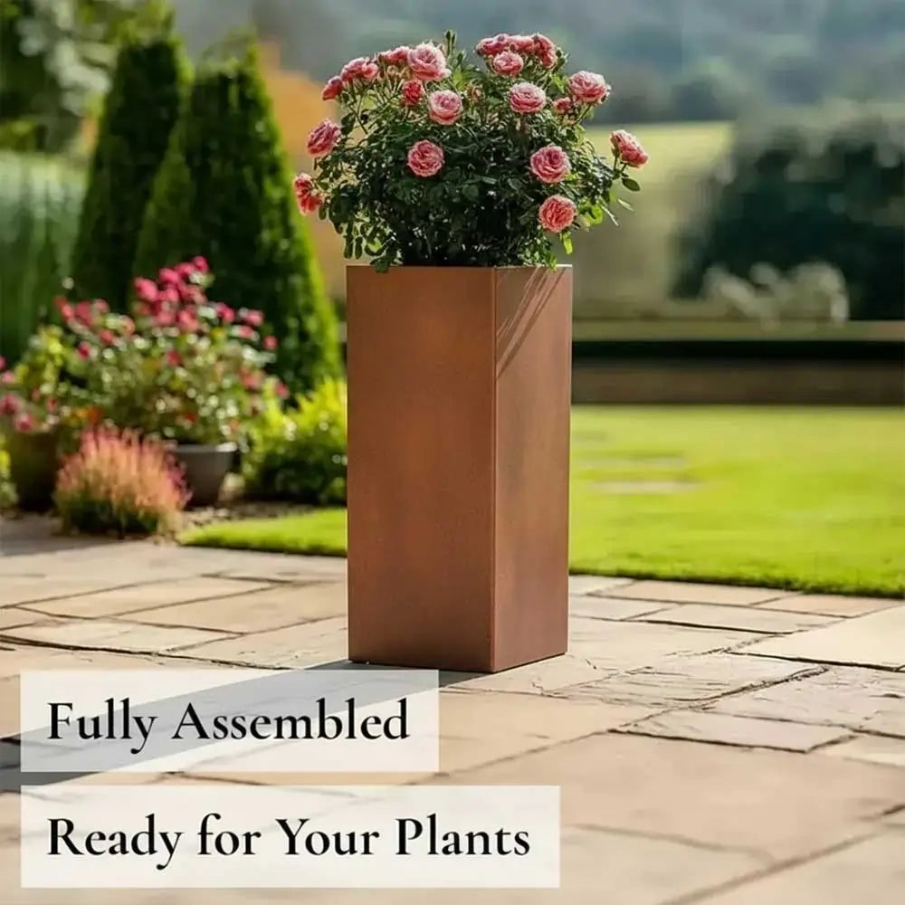 This tall square planter, crafted from durable galvanised aluzinc, features a striking shiny copper finish that adds a modern, elegant touch to any outdoor or indoor space. Lightweight yet sturdy, it’s easy to move while maintaining excellent weather resistance. Perfect for tall plants such as bamboo, ornamental grasses, or small trees like olive or bay, it offers a stylish and practical solution for enhancing gardens, patios, or entrances.