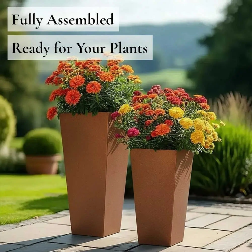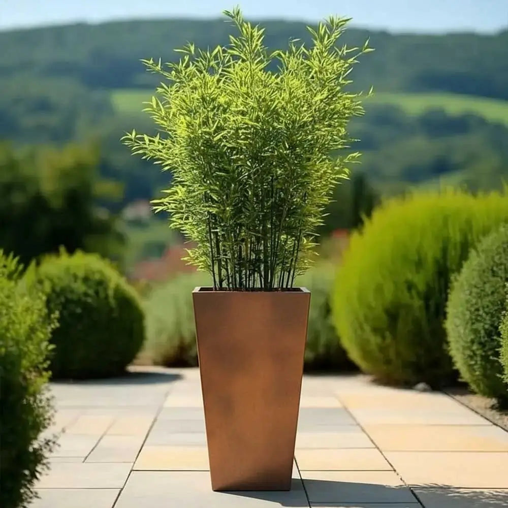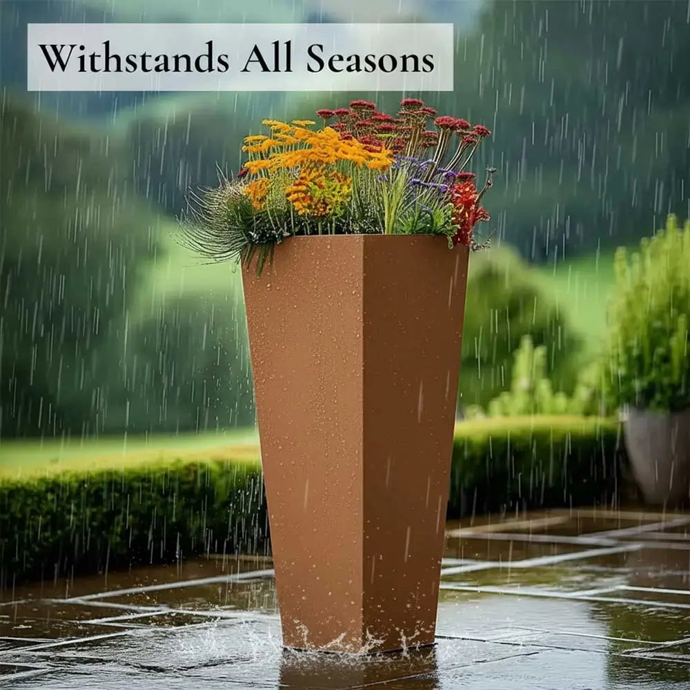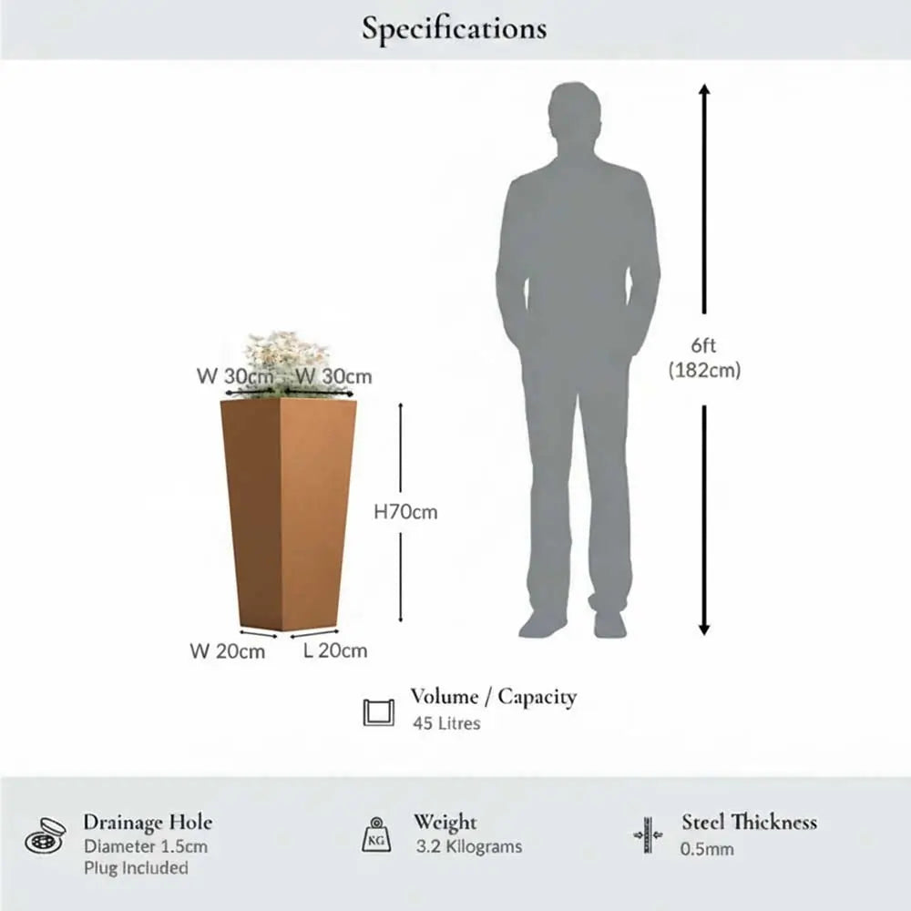This 70cm tall square planter, crafted from robust galvanised aluzinc, features a shiny copper finish that adds a modern, sophisticated look to any outdoor or indoor space. Lightweight yet durable, it’s perfect for planting smaller plants like lavender, heather, ferns, or even colourful petunias. Its compact height and elegant design make it ideal for enhancing patios, balconies, or entrances with stylish greenery.