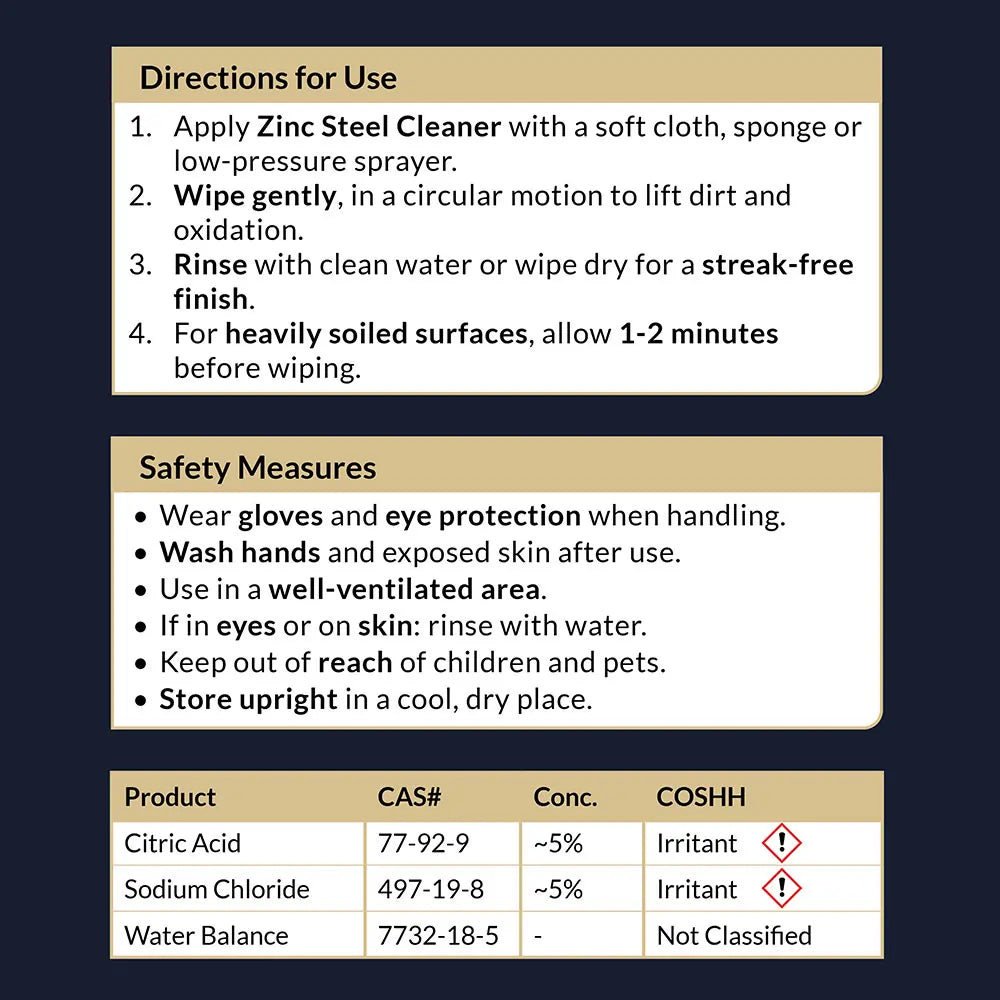 Zinc Cleaner is a purpose-formulated, non-abrasive cleaner engineered to gently clean and maintain zinc powder-coated finishes without compromising their protective integrity or appearance. Designed for regular maintenance in industrial, architectural, and marine environments, Mild Zinc Powder Cleaner effectively removes airborne contaminants, grime, oxidation residues, and environmental buildup from zinc-coated surfaces.
