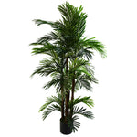 Artificial Areca palm tree. This tree has silk leaves and natural palm frond additions at the base which make it look really realistic. As we have it arranged in our photos this measures 150cm x 80cm x 80cm. The branches are wired and so the leaves can be shaped to fit your space if you need it to be narrower or wider. It comes potted in a weighted black plastic pot (measuring 18cm (d) x 14cm (h) approx.) These trees look most impressive if you put them inside a decorative planter and cover the top with gravel or soil.