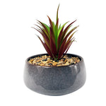Ceramic Blue Dish Planter with Artificial Red Dracaena Plant. Overall measurements: 18cm (h) x 14cm (w) x 14cm (d). Ceramic planter measures: 14cm (w) x 7cm (h) approx. Plant comes fully potted in the small ceramic planter shown. This is a blue misted design which looks fantastic on a desk. Decorative stones are fully fixed and won't come loose. Ready to display. Available with a choice of plants.