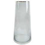 Smoke grey glass vase with gold rim. 28cm tall x 13.5cm x 13.5cm at widest points. The slightly narrower top rim measures 9.5cm diameter. Thick and high-quality glass vase. This is suitable for both real and artificial flowers. These glass vases are hand finished and there may be small differences between them. We have also included some pictures along with some of our artificial flowers to give an idea of size and usage but no flowers are included with this vase.