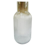 Ridged contemporary style glass vase with a slight ombre colouration towards chestnut at the top – very subtle and stylish. 34cm x 16cm x 16cm at widest points. The slightly narrower top rim measures 9cm diameter. Thick glass. This is suitable for both real and artificial flowers. These glass vases are hand finished and there may be small differences between them. We have also included some pictures along with some of our artificial flowers to give an idea of size and usage but no flowers are included with this vase.
