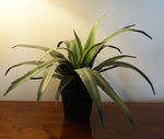 This tropical aloe plant has wired soft plastic leaves which can be arranged to suit your space. As we have it arranged in our photos this measures 40cm tall x 50cm wide x 50cm depth. This comes potted in a small black plastic pot measuring 10cm (h) x 12cm (w). To make this even more realistic put it inside a decorative planter and cover with gravel or bark. Highly realistic.