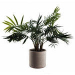 Realistic palm in a decorative composite cement style planter, ready to display straight out of the box. Thick dense leaves with individually shaped fronds. The stems are wired and the leaves can be shaped to fit your space. As we have the palm arranged in our photos it measures 40cm x 40cm x 40cm. The decorative composite cement style planter has a rustic finish and measures 11cm (h) x 12cm (w). The leaves are plastic. The decorative planter is topped with fixed pebbles for an attractive, low maintenance finish.