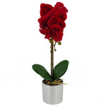 Realistic artificial orchid plant with real touch leaves, glued fixed gravel base, potted in a plastic decorative pot as shown. 7 real touch flowers. Pot is plastic and measures 9cm (h) x 10cm (w) Overall height as arranged in our photos 46cm. Stems are wired and this plant can be arranged to your requirements.