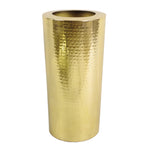 This metal vase measures 15cm wide x 30cm high. It is made of metal with a hammered gold finish. The inner diameter is 10cm.