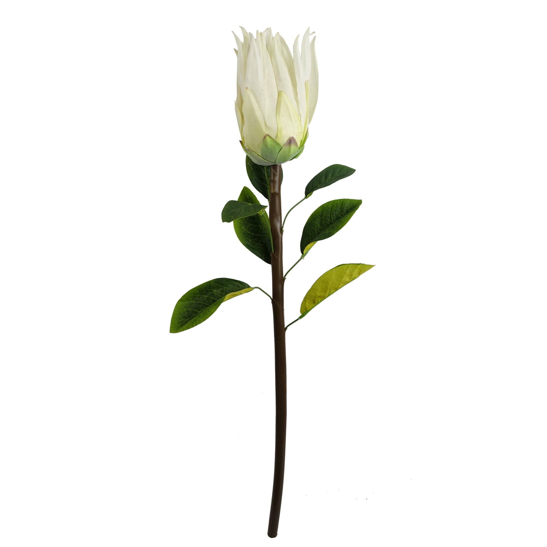 Pack of 6 x 65cm Protea Sugarbush Flower stems - White. Realistic 65cm artificial sugarbush protea stems, featuring a beautifully crafted flowers with silk petals, plastic centre and realistic silk leaves. The wired stems allows for easy shaping and arrangement, making it a versatile addition to any decor. These look particularly nice when combined with foliage to create a larger display.