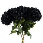 Pack of 6 x Black extra large Reflex Chrysanthemum with silk petals. Can be used to make arrangements with our other artificial flowers or as decorations on their own. Each stem measures 75cm overall height x 20cm wide x 20 deep and has a single large flower head. Flowers are silk. These are easy to cut down shorter using a pair of wire cutters if required. Some of our photos show vases to give an idea of size and possibilities for arrangement but no vases or planters are included with these flowers.