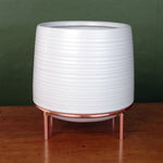 Leaf Design Ceramic Planter. Measures 17 (d) x 17 (w) x 18cm (h) including metal stand. Overall this is 18cm high including the stand. Inner hole diameter is 13.5cm so any of our plants with pots less than this will fit inside. This has no drainage hole so is also suitable for real plants. Metal stand height is 5cm.