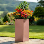 Elevate your garden oasis with our expertly crafted Galvanised Rose Gold Tall Square Planter. Impeccably designed and powder coated for enduring beauty, it's not just a tall planter – it's a statement piece. Versatile as a tree planter or for your favourite florals, its sleek silhouette adds sophistication to any space. This tall outdoor planter is perfect for entrances and patios.