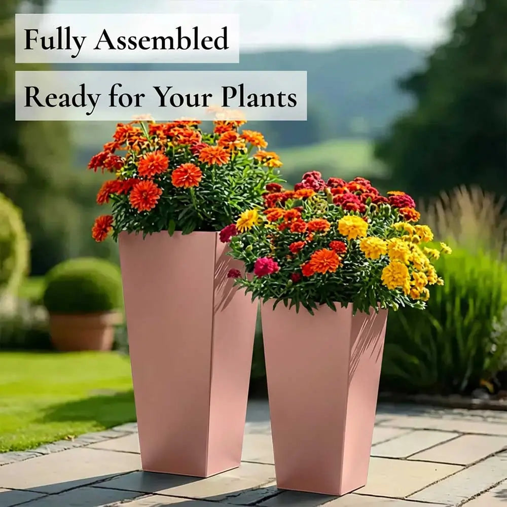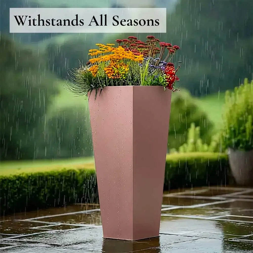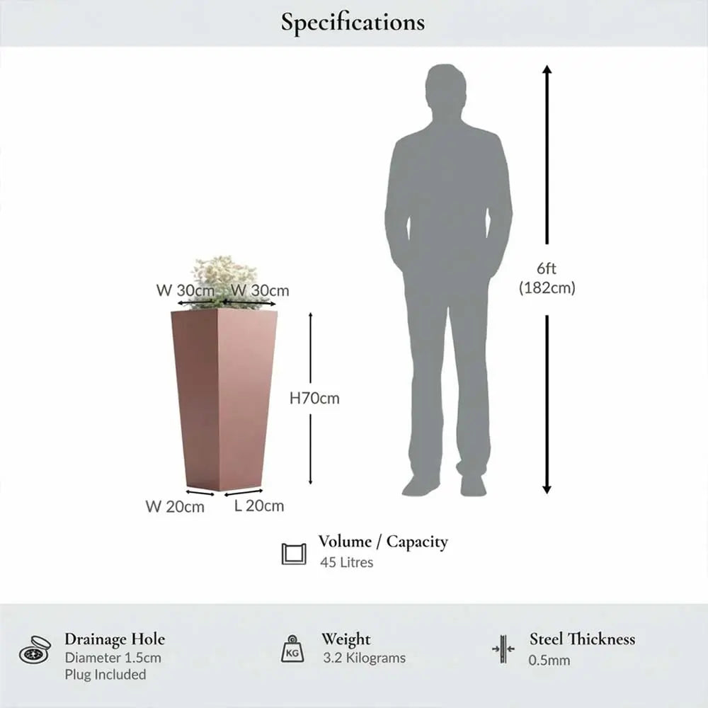 This 70cm tall square planter, crafted from robust galvanised aluzinc, features a shiny copper finish that adds a modern, sophisticated look to any outdoor or indoor space. Lightweight yet durable, it’s perfect for planting smaller plants like lavender, heather, ferns, or even colourful petunias. Its compact height and elegant design make it ideal for enhancing patios, balconies, or entrances with stylish greenery.