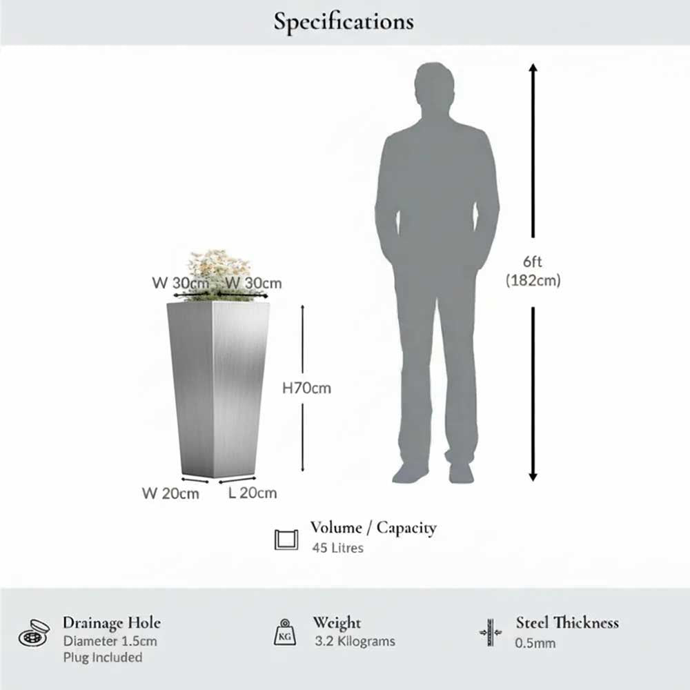 Crafted from durable galvanised aluzinc, this 70cm tall tapered silver planter exudes elegance and class. Perfect for trees or ornamental plants, its lightweight design ensures easy maneuverability while maintaining robustness. This planter seamlessly combines durability with sophistication, elevating any outdoor space with timeless charm.