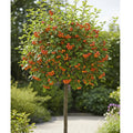- Showcases stunning white blossoms in spring, followed by striking red-orange fruits.