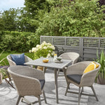 Combines curvy woven chairs in a light grey weave and a grey wash FSC® Acacia Table.