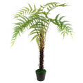 Artifical fern tree potted in black plastic pot, ideal for placing inside a larger decorative planter of your choice. Tree when measured as arranged in our photos is 120 x 90 x 90cm. Plastic base pot measures 15cm x 12cm. Leaves plastic. Trunk artificial.