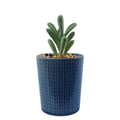 Ceramic Blue Stripe Planter with Artificial Succulent Plant. Overall measurements: 17cm (h) x 8cm (w) x 8cm (d). Ceramic planter measures: 8cm (w) x 9cm (h) approx. Plant comes fully potted in the small ceramic planter shown. This is an embossed stripe design which looks fantastic on a desk or in a window. Decorative stones are fully fixed and won't come loose. Ready to display. Available with a choice of plants.