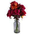 A beautifully realistic rose arrangement in a glass vase. Fixed with fake water.