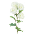 White artificial carnation stem. Can be used to make arrangements with our other artificial flowers or as decorations on their own. Each stem measures 70cm overall height x 15cm wide and has four flowers. Flowers are silk. These are easy to cut down shorter using a pair of wire cutters if required. Some of our photos show vases to give an idea of size and possibilities for arrangement but no vases or planters are included with these flowers.