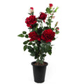Potted rose with 4 flowers, 6 buds and 180 leaves potted in a black plastic pot . As we have it arranged this plant measures 80cm x 35cm x 35cm. The pot measures 18cm (w) x 19cm (h) and is topped with artificial soil. This product is designed for indoor use only. Petals and leaves are fabric. Stems are wired and can be arranged.