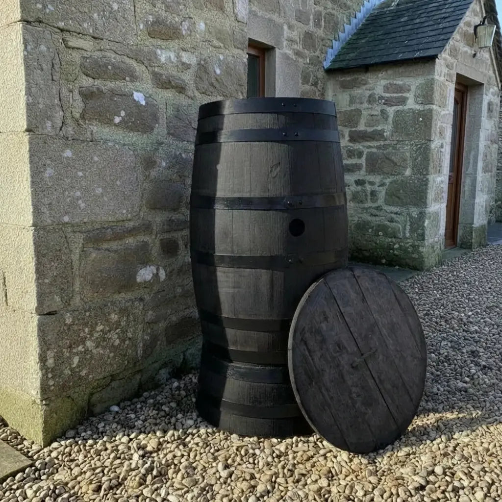 Enhance your outdoor space with the 100L Black Full Oak Barrel Water Butt, beautifully handcrafted from genuine reclaimed oak barrels. Each piece showcases the authentic character and strength of traditional cooperage, making it as practical as it is visually striking.