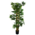 Artificial Bamboo tree. This tree has silk leaves and natural large size bamboo canes really realistic. As we have it arranged in our photos this measures 150cm x 90cm x 90cm. The branches are wired and so the leaves can be shaped to fit your space if you need it to be narrower or wider. It comes potted in a weighted black plastic pot (measuring 18cm (d) x 14cm (h) approx.) These trees look most impressive if you put them inside a decorative planter and cover the top with gravel or soil.