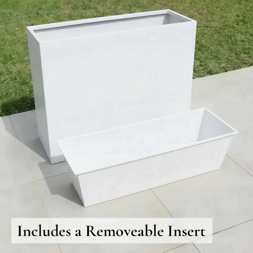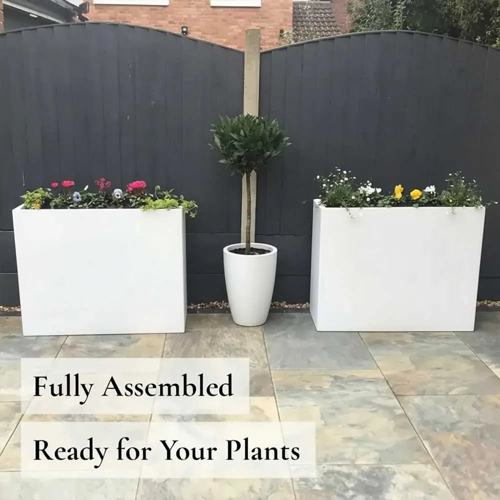 This long tall trough planter is a premium and stylish home for your plants. It comes with an insert and multiple drainage holes, to minimise your soil usage and to help prevent root rot. This tall trough planter is perfect for planting a row of flowers. With a stunning white colour, this large planter creates an amazing display with your plants.