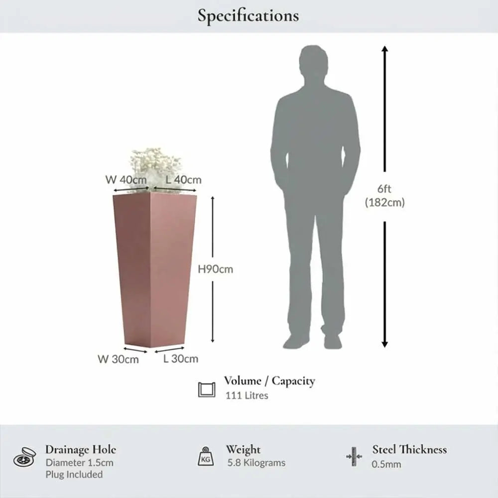 This 90cm tall tapered square rose gold planter is a stunning addition to any garden or entrance. A durable metal planter, it combines elegance with functionality. As a versatile tall planter, it’s perfect for use as a tree planter, accommodating plants like olive trees, bay trees, or bamboo. Its striking design and robust construction make it a timeless choice for outdoor spaces.