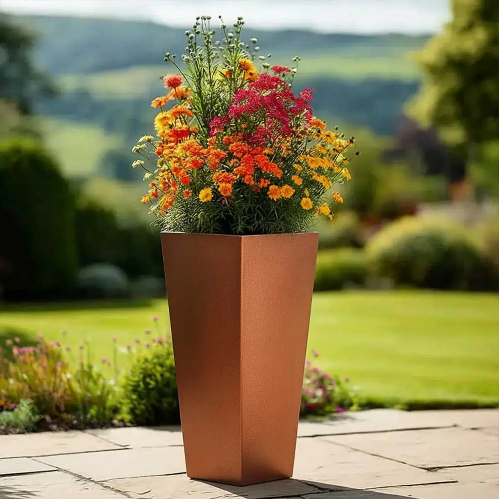 This 90cm tall tapered square copper planter is a stunning addition to any garden or entrance. A durable metal planter, it combines elegance with functionality. As a versatile tall planter, it’s perfect for use as a tree planter, accommodating plants like olive trees, bay trees, or bamboo. Its striking design and robust construction make it a timeless choice for outdoor spaces.