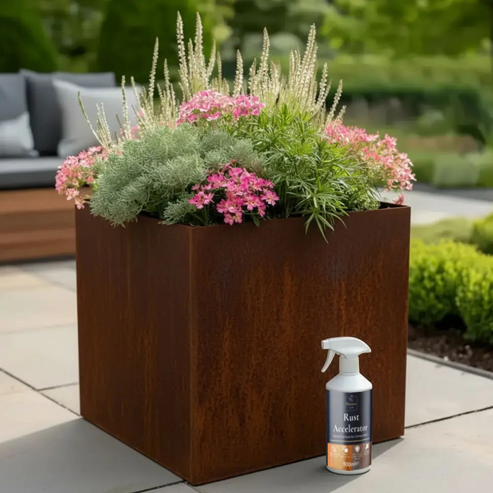 Ideal for planters, architectural elements, fountains, or sculptures, this formula creates a deep, natural rust tone that matures over time into the warm, rich patina characteristic of well-aged steel, without compromising safety or surface integrity.