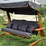 Water-repellant and stain resistant fabric on the canopy. Luxuriously comfortable cushions built with ecotex certified polyester.